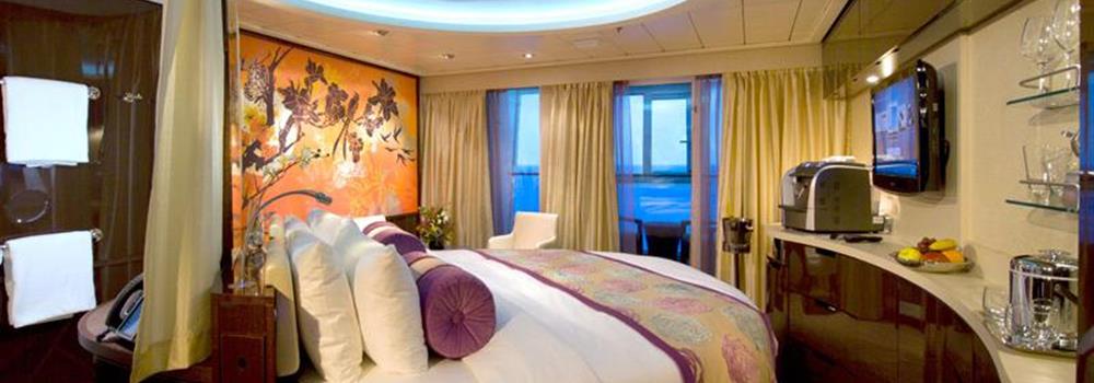 - 客艙內兩個單人床可轉換為一張大床,客房備有上拉式雙層床,以容納第三第四位賓客入住,一個休息區,一個帶沐浴的私人浴室,冰箱,迷你保險箱,電視,音樂控制臺,直撥電話,吹風機,24小時客房服務。
